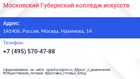 Московский Губернский колледж искусств по адресу 141406, Россия, Москва, Нахимова, 14 в дальнейшем Организация, размещена в следующих категориях: