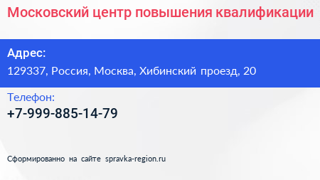 Московский центр повышения квалификации по адресу 129337, Россия, Москва, Хибинский проезд, 20 в дальнейшем Организация, размещена в следующих категориях: