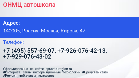 ОНМЦ, автошкола по адресу 140005, Россия, Москва, Кирова, 47 в дальнейшем Организация, размещена в следующих категориях:
