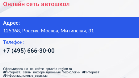 Онлайн, сеть автошкол по адресу 125368, Россия, Москва, Митинская, 31 в дальнейшем Организация, размещена в следующих категориях:
