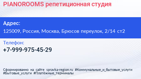 PIANOROOMS, репетиционная студия по адресу 125009, Россия, Москва, Брюсов переулок, 2/14 ст2 в дальнейшем Организация, размещена в следующих категориях: