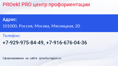 PROekt PRO, центр профориентации по адресу 101000, Россия, Москва, Мясницкая, 20 в дальнейшем Организация, размещена в следующих категориях: