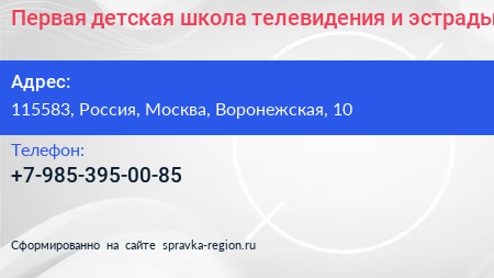 Первая детская школа телевидения и эстрады по адресу 115583, Россия, Москва, Воронежская, 10 в дальнейшем Организация, размещена в следующих категориях: