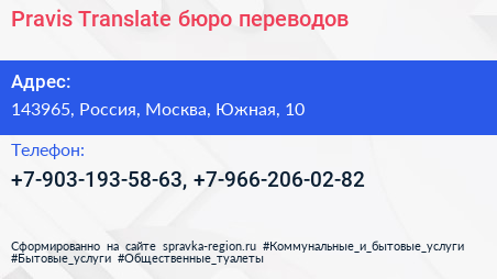 Pravis Translate, бюро переводов по адресу 143965, Россия, Москва, Южная, 10 в дальнейшем Организация, размещена в следующих категориях: