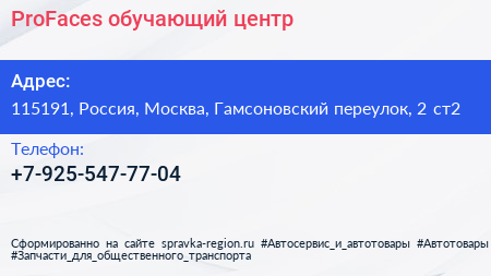 ProFaces, обучающий центр по адресу 115191, Россия, Москва, Гамсоновский переулок, 2 ст2 в дальнейшем Организация, размещена в следующих категориях: