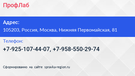 ПрофЛаб по адресу 105203, Россия, Москва, Нижняя Первомайская, 81 в дальнейшем Организация, размещена в следующих категориях: