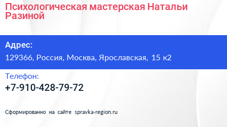 Психологическая мастерская Натальи Разиной по адресу 129366, Россия, Москва, Ярославская, 15 к2 в дальнейшем Организация, размещена в следующих категориях: