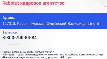 Rabotut, кадровое агентство по адресу 127018, Россия, Москва, Сущёвский Вал улица, 16 ст6 в дальнейшем Организация, размещена в следующих категориях: