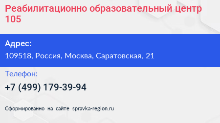 Реабилитационно-образовательный центр №105 по адресу 109518, Россия, Москва, Саратовская, 21 в дальнейшем Организация, размещена в следующих категориях: