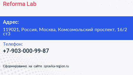 Reforma Lab по адресу 119021, Россия, Москва, Комсомольский проспект, 16/2 ст3 в дальнейшем Организация, размещена в следующих категориях: