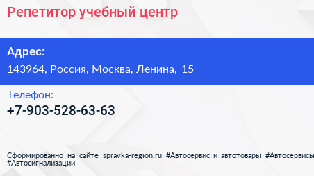 Репетитор, учебный центр по адресу 143964, Россия, Москва, Ленина, 15 в дальнейшем Организация, размещена в следующих категориях: