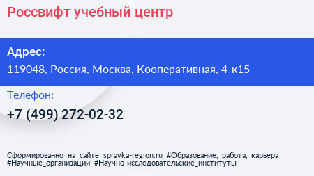 Россвифт, учебный центр по адресу 119048, Россия, Москва, Кооперативная, 4 к15 в дальнейшем Организация, размещена в следующих категориях: