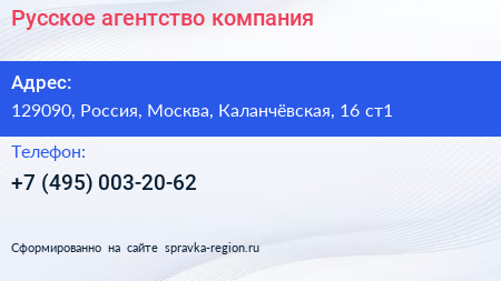 Русское агентство, компания по адресу 129090, Россия, Москва, Каланчёвская, 16 ст1 в дальнейшем Организация, размещена в следующих категориях: