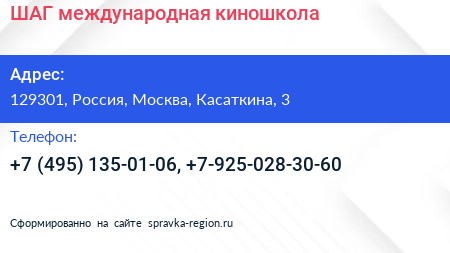 ШАГ, международная киношкола по адресу 129301, Россия, Москва, Касаткина, 3 в дальнейшем Организация, размещена в следующих категориях: