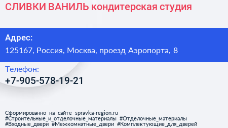 СЛИВКИ & ВАНИЛЬ, кондитерская студия по адресу 125167, Россия, Москва, проезд Аэропорта, 8 в дальнейшем Организация, размещена в следующих категориях: