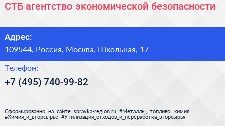 СТБ, агентство экономической безопасности по адресу 109544, Россия, Москва, Школьная, 17 в дальнейшем Организация, размещена в следующих категориях: