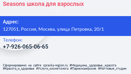 Seasons, школа для взрослых по адресу 127051, Россия, Москва, улица Петровка, 20/1 в дальнейшем Организация, размещена в следующих категориях:
