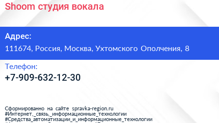 Shoom, студия вокала по адресу 111674, Россия, Москва, Ухтомского Ополчения, 8 в дальнейшем Организация, размещена в следующих категориях: