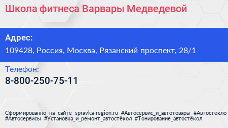 Школа фитнеса Варвары Медведевой по адресу 109428, Россия, Москва, Рязанский проспект, 28/1 в дальнейшем Организация, размещена в следующих категориях: