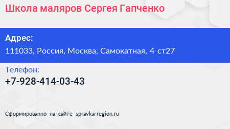 Школа маляров Сергея Гапченко по адресу 111033, Россия, Москва, Самокатная, 4 ст27 в дальнейшем Организация, размещена в следующих категориях: