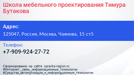 Школа мебельного проектирования Тимура Бутакова по адресу 125047, Россия, Москва, Чаянова, 15 ст5 в дальнейшем Организация, размещена в следующих категориях: