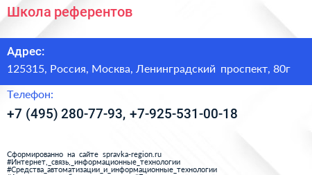 Школа референтов по адресу 125315, Россия, Москва, Ленинградский проспект, 80г в дальнейшем Организация, размещена в следующих категориях: