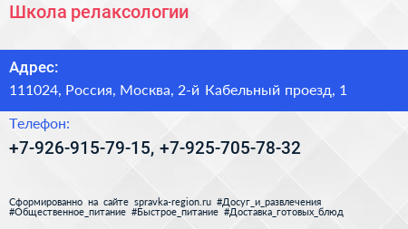 Школа релаксологии по адресу 111024, Россия, Москва, 2-й Кабельный проезд, 1 в дальнейшем Организация, размещена в следующих категориях: