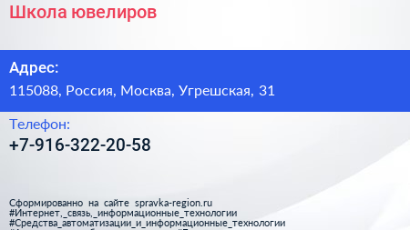 Школа ювелиров по адресу 115088, Россия, Москва, Угрешская, 31 в дальнейшем Организация, размещена в следующих категориях: