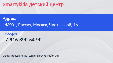 Smartykids, детский центр по адресу 143001, Россия, Москва, Чистяковой, 16 в дальнейшем Организация, размещена в следующих категориях: