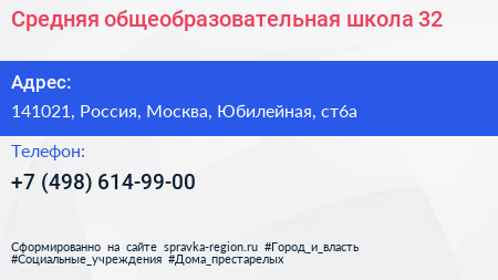 Средняя общеобразовательная школа №32 по адресу 141021, Россия, Москва, Юбилейная, ст6а в дальнейшем Организация, размещена в следующих категориях: