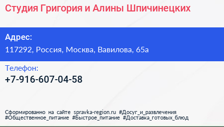 Студия Григория и Алины Шпичинецких по адресу 117292, Россия, Москва, Вавилова, 65а в дальнейшем Организация, размещена в следующих категориях:
