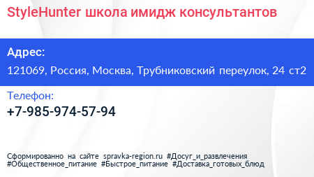 StyleHunter, школа имидж-консультантов по адресу 121069, Россия, Москва, Трубниковский переулок, 24 ст2 в дальнейшем Организация, размещена в следующих категориях: