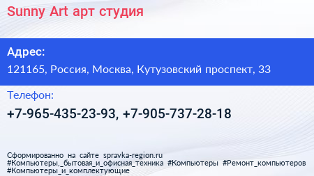 Sunny Art, арт-студия по адресу 121165, Россия, Москва, Кутузовский проспект, 33 в дальнейшем Организация, размещена в следующих категориях: