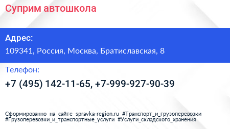 Суприм, автошкола по адресу 109341, Россия, Москва, Братиславская, 8 в дальнейшем Организация, размещена в следующих категориях: