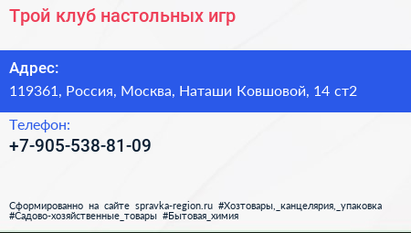 Трой, клуб настольных игр по адресу 119361, Россия, Москва, Наташи Ковшовой, 14 ст2 в дальнейшем Организация, размещена в следующих категориях: