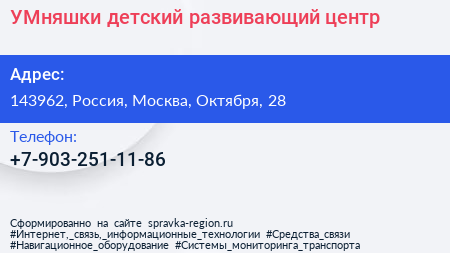 УМняшки, детский развивающий центр по адресу 143962, Россия, Москва, Октября, 28 в дальнейшем Организация, размещена в следующих категориях: