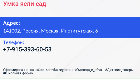 Умка, ясли-сад по адресу 141002, Россия, Москва, Институтская, 6 в дальнейшем Организация, размещена в следующих категориях: