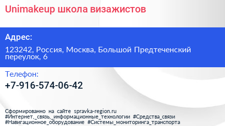 Unimakeup, школа визажистов по адресу 123242, Россия, Москва, Большой Предтеченский переулок, 6 в дальнейшем Организация, размещена в следующих категориях: