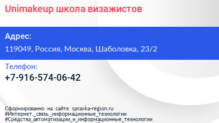 Unimakeup, школа визажистов по адресу 119049, Россия, Москва, Шаболовка, 23/2 в дальнейшем Организация, размещена в следующих категориях:
