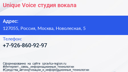 Unique Voice, студия вокала по адресу 127055, Россия, Москва, Новолесная, 5 в дальнейшем Организация, размещена в следующих категориях: