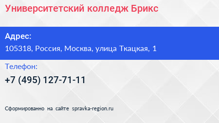 Университетский колледж Брикс по адресу 105318, Россия, Москва, улица Ткацкая, 1 в дальнейшем Организация, размещена в следующих категориях: