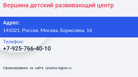 Вершина, детский развивающий центр по адресу 141021, Россия, Москва, Борисовка, 16 в дальнейшем Организация, размещена в следующих категориях: