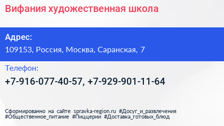 Вифания, художественная школа по адресу 109153, Россия, Москва, Саранская, 7 в дальнейшем Организация, размещена в следующих категориях: