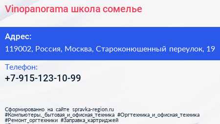 Vinopanorama, школа сомелье по адресу 119002, Россия, Москва, Староконюшенный переулок, 19 в дальнейшем Организация, размещена в следующих категориях: