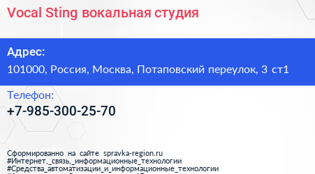 Vocal Sting, вокальная студия по адресу 101000, Россия, Москва, Потаповский переулок, 3 ст1 в дальнейшем Организация, размещена в следующих категориях: