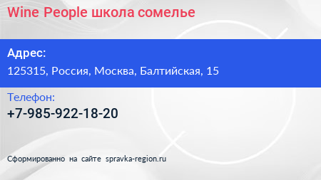 Wine People, школа сомелье по адресу 125315, Россия, Москва, Балтийская, 15 в дальнейшем Организация, размещена в следующих категориях: