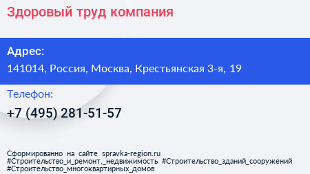 Здоровый труд, компания по адресу 141014, Россия, Москва, Крестьянская 3-я, 19 в дальнейшем Организация, размещена в следующих категориях:
