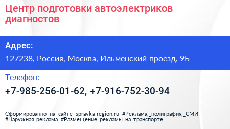 Центр подготовки автоэлектриков-диагностов по адресу 127238, Россия, Москва, Ильменский проезд, 9Б в дальнейшем Организация, размещена в следующих категориях: