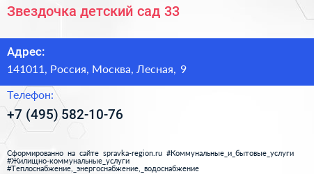 Звездочка, детский сад №33 по адресу 141011, Россия, Москва, Лесная, 9 в дальнейшем Организация, размещена в следующих категориях: