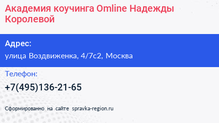 Академия коучинга Omline Надежды Королевой по адресу улица Воздвиженка, 4/7с2, Москва в дальнейшем Организация, размещена в следующих категориях: